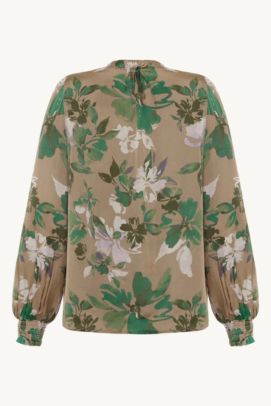 Paita kudottua viskoosia, jossa on kukkakuvio, laskokset edessä, väljät hihat, laskokset olkapäillä ja resori hihoissa.
