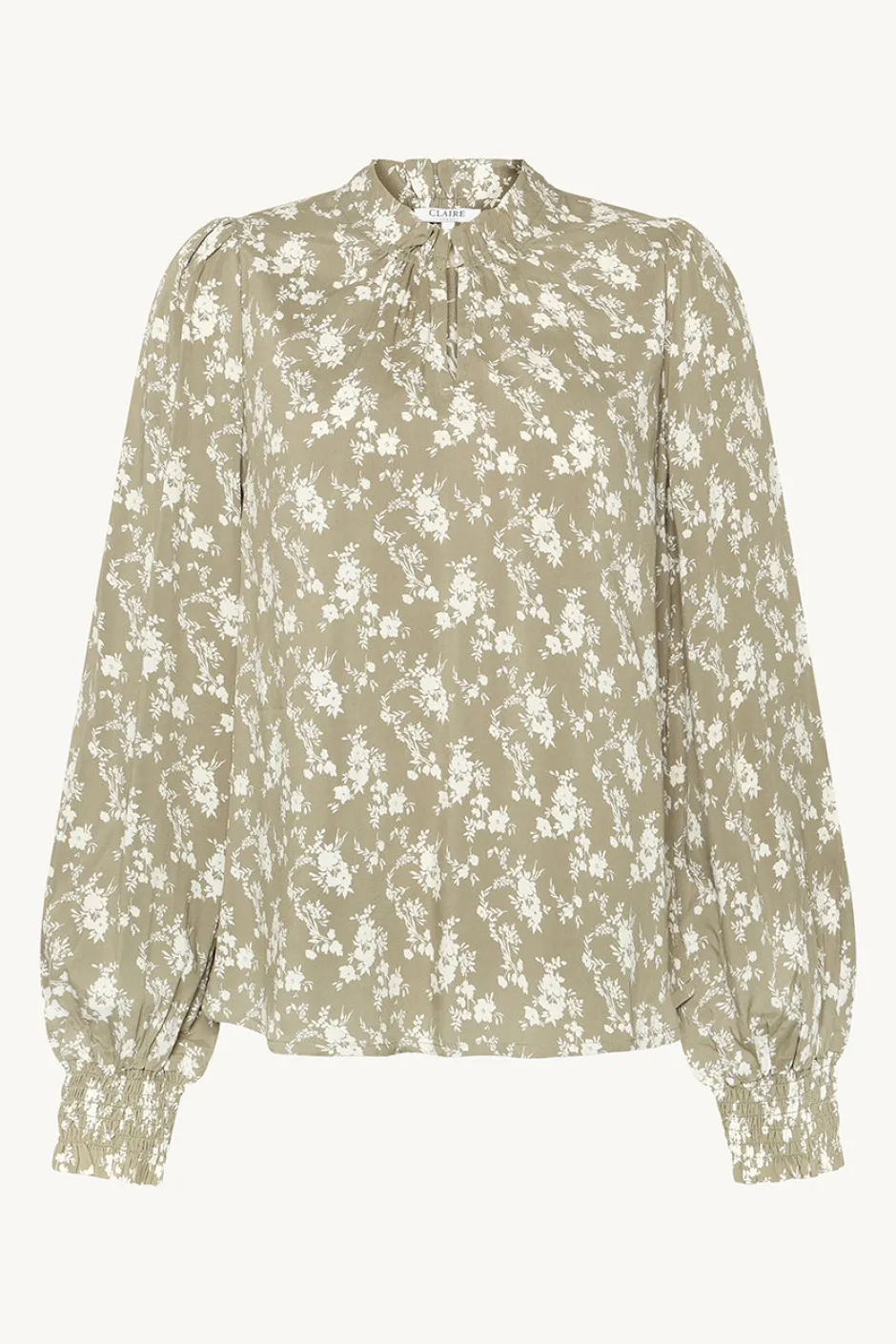 Paita kudottua viskoosia, jossa on kukkakuvio, laskokset ja nappikiinnitys niskassa. Paidassa on laskokset olkapäillä ja resori hihoissa sekä halkiot sivuissa.