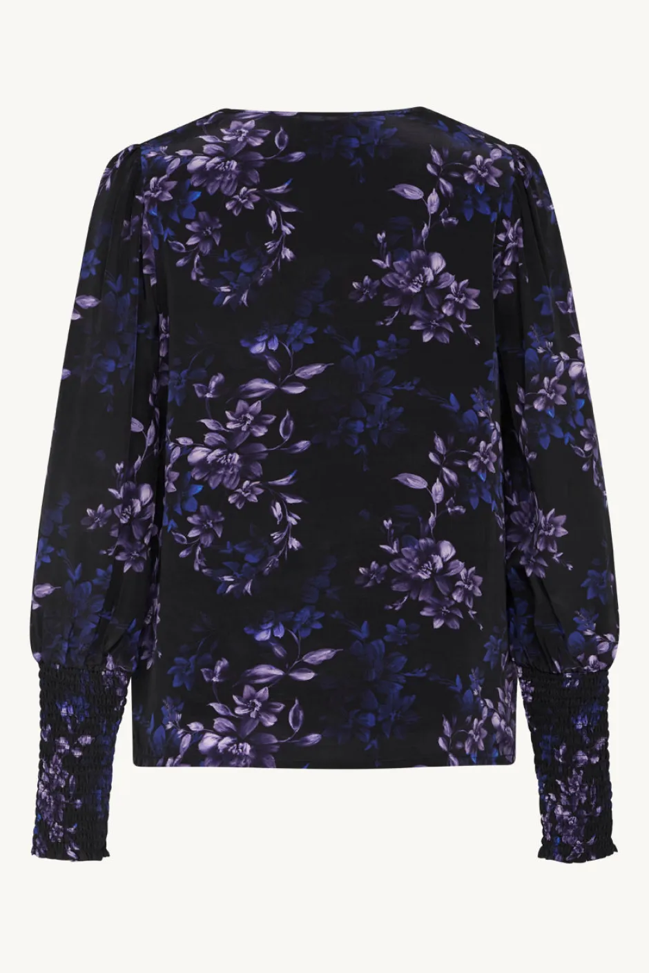 Naisten viskoosipusero V-pääntiellä ja hihoissa on leveät smokkirypytykset. Punaisessa kankaassa on hillitty musta kukkakuviointi. Suora helma.