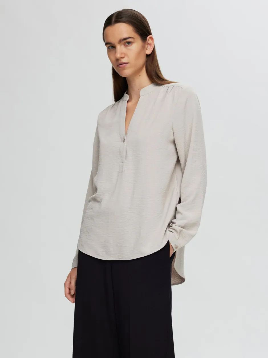 Monipuolinen pusero jokaisen vaatekaappiin. – V-kaula-aukko nauhakauluksella – Yksirivinen napitus – Pitkät napitettavat hihat – Väljä istuvuus