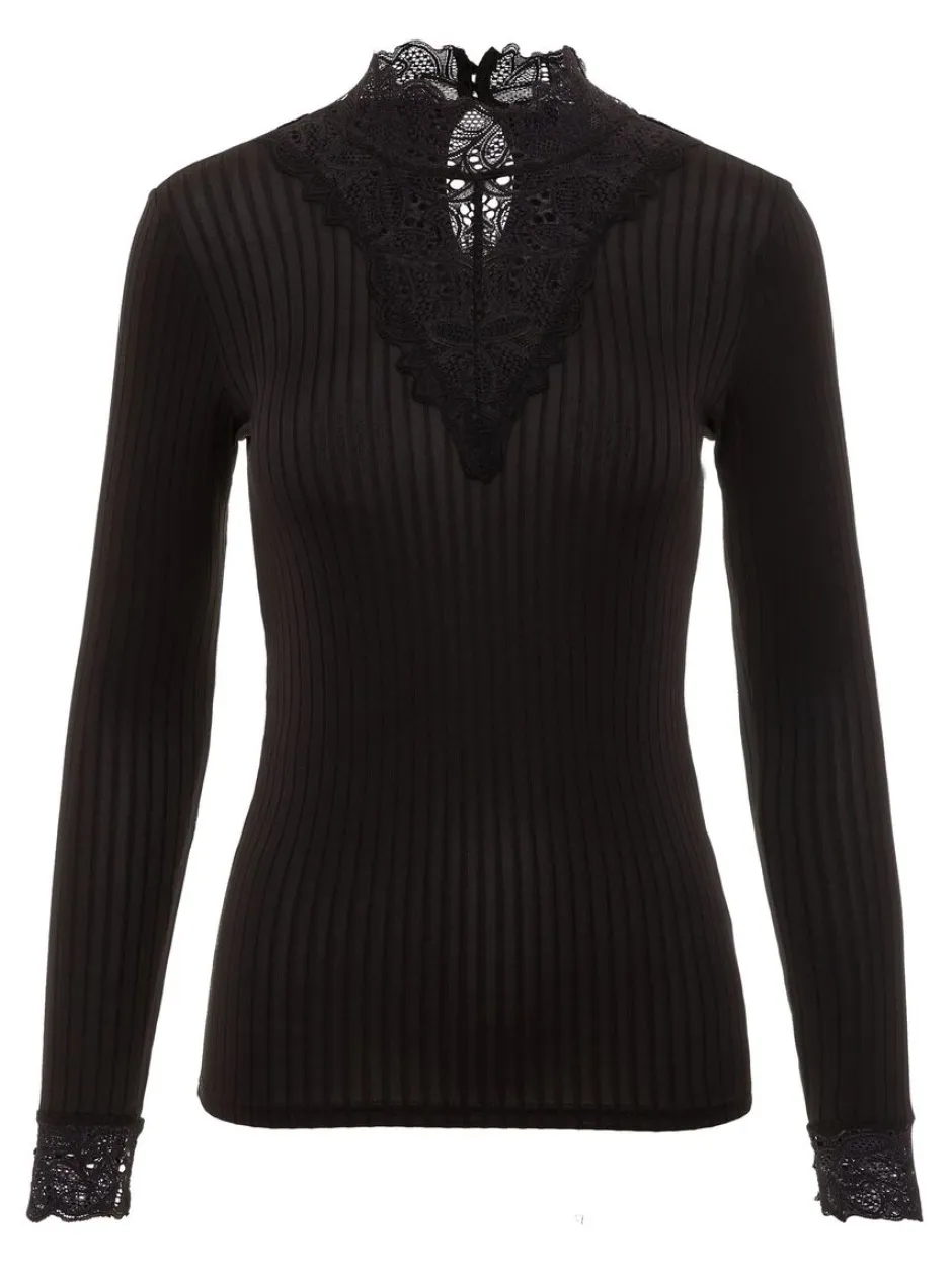 Y.A.S naisten pitkähihainen ribbikangas pusero. Puserossa v-kaula-aukossa ja hihoissa pitsiä yksityiskohtina. Puserossa korkea kaulus. Pusero on joustavaa materiaalia. Lisäksi puseron takana napitus.