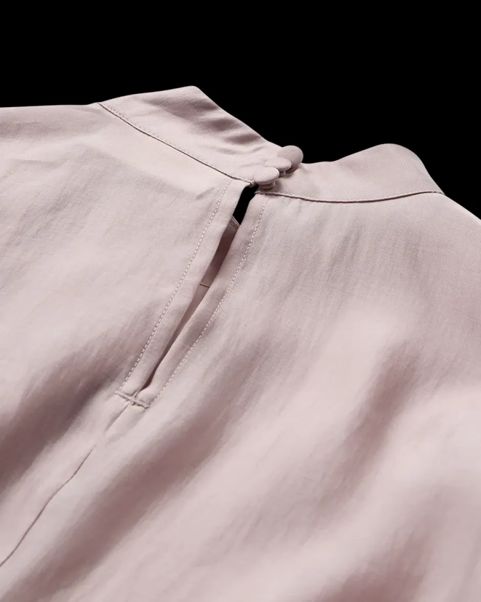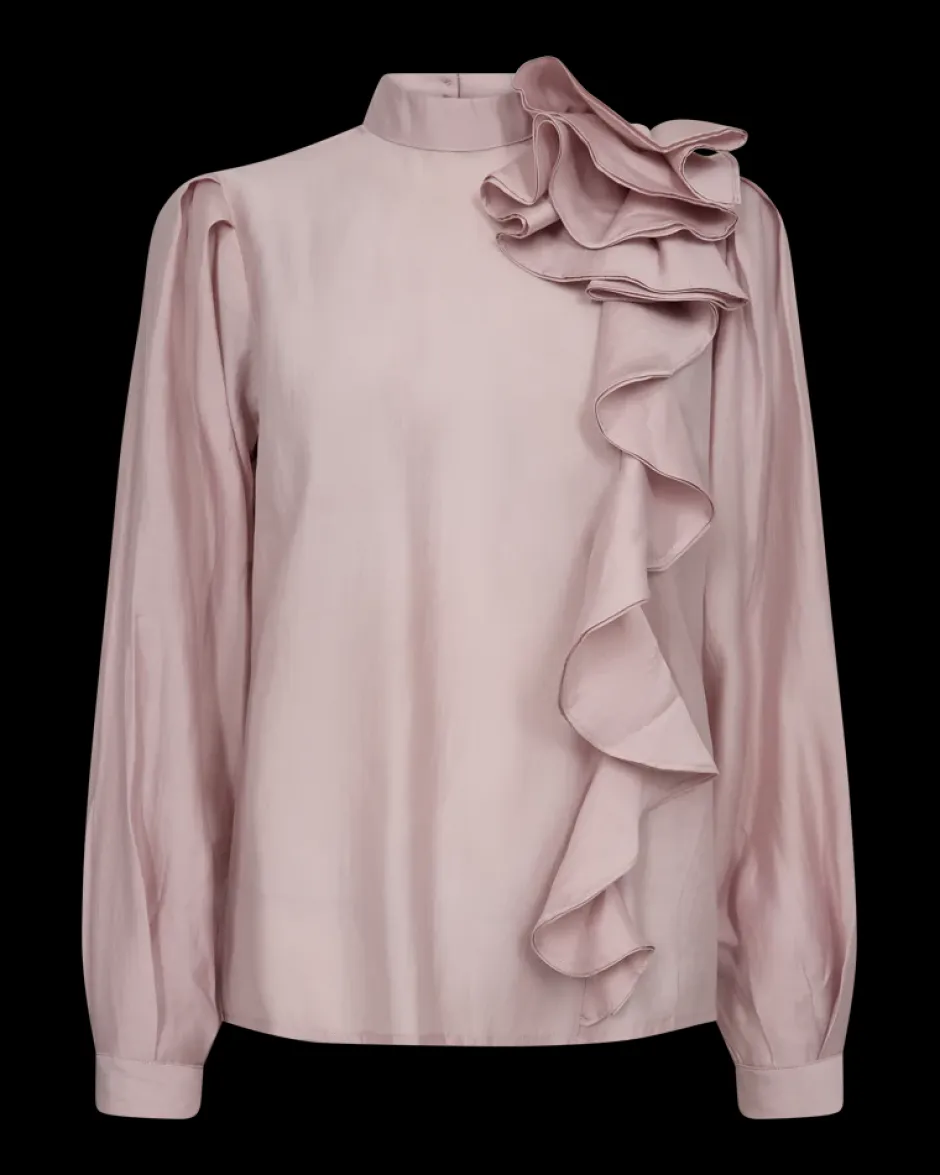 CMMOLLY-BLOUSE on ikonisen herkullinen pusero, joka sisältää paljon lyocellia. Puserossa on pitkät, runsaat hihat, joissa on laskoksia ja hihansuita, takana halkio kangasnapeilla, korkea kaulus ja edessä näyttävä röyhelö, joka luo kontrastin minimalistiselle tyylille.