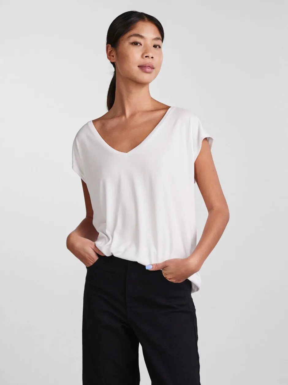 Pieces T-paidassa on joustava ja miellyttävä laatu. Pääntienä kaunis V. Suora istuvuus