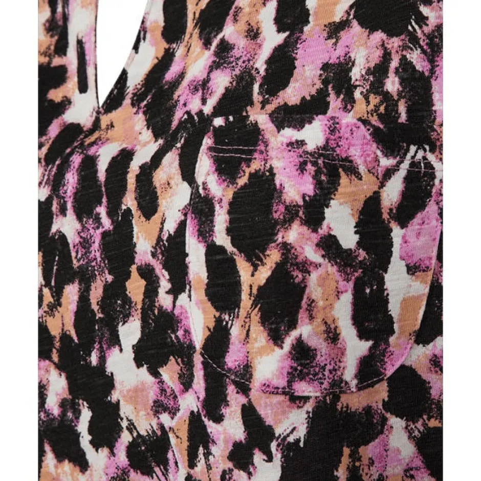 Tässä Freequentin lyhythihaisessa puserossa yhdistyy trendikäs design ja rento käyttömukavuus. Pusero on valmistettu pehmeästä ja hengittävästä materiaalista, ja sen rento leikkaus tekee siitä täydellisen arkeen tai vapaalle. Katseenvangitseva leopardihenkinen kuosi yhdistää mustaa, valkoista, pinkkiä ja hiekan sävyjä, luoden näyttävän mutta helposti yhdisteltävän ilmeen. V-kaula-aukko ja hihat ilman erillisiä saumoja viimeistelevät modernin siluetin.