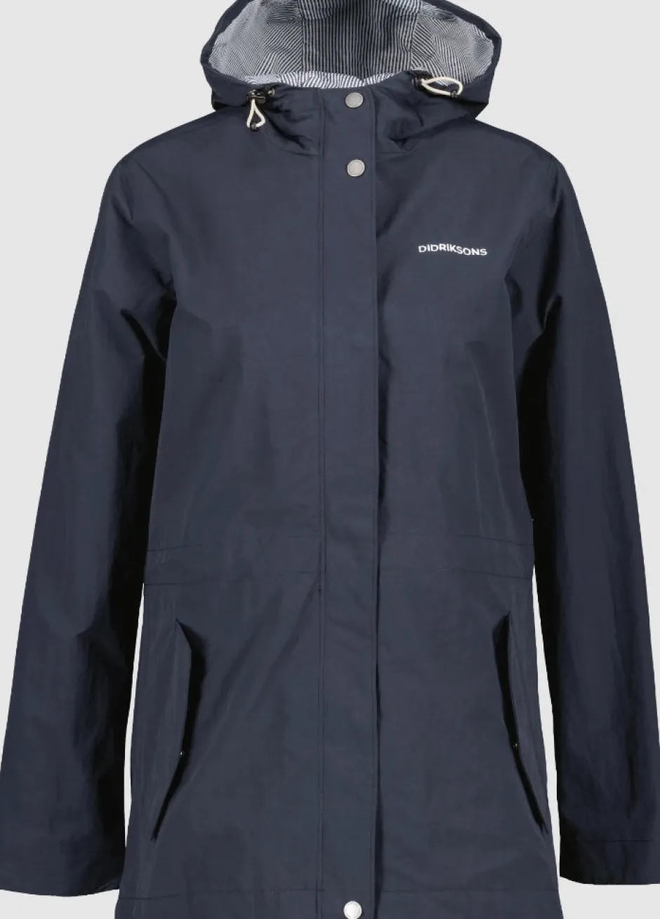 Maria on rento takapuolelta pidennetty parka, jossa on klassinen Didriksons-raitavuori, mikä tekee tästä parkasta loistavan valinnan jokapäiväiseen käyttöön. Takissa on kaksi taskua sekä säädettävä vyötärö ja huppu. Kangas on vettähylkivää ja valmistettu 100% kierrätetystä polyamidista, joka tuntuu pehmeältä.