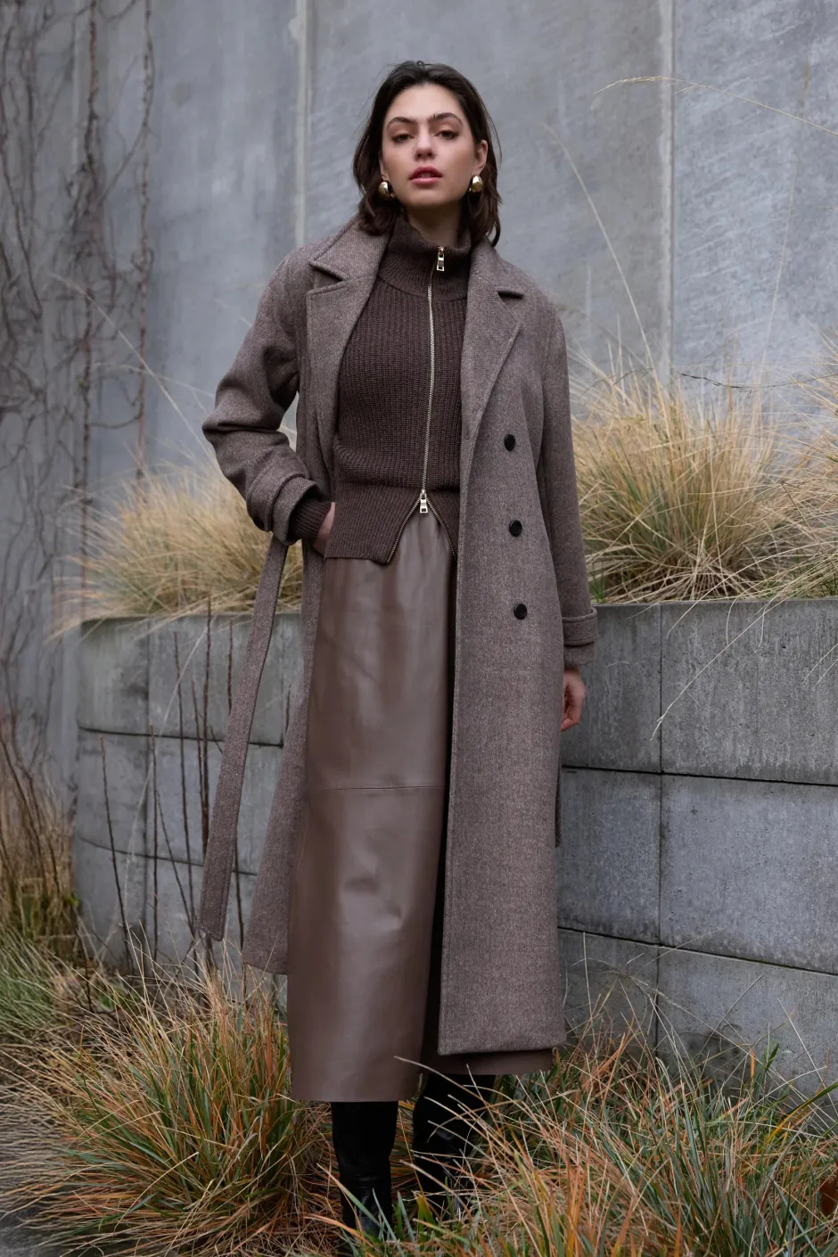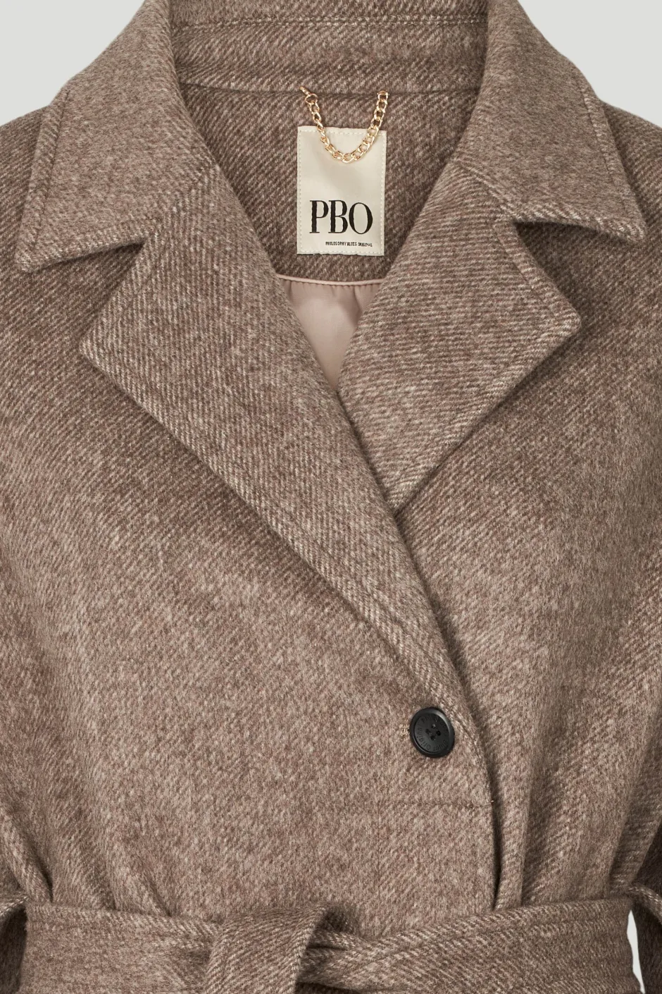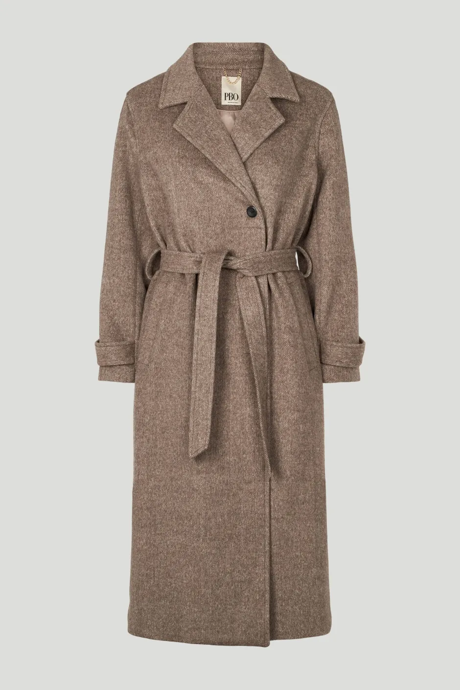 Sabotage on pitkä, kietaisuefektillä varustettu takki, jossa on selkeä vyötärö ja leveä kaulus. Vyökiinnitys ja yksi nappi antavat elegantin ilmeen.