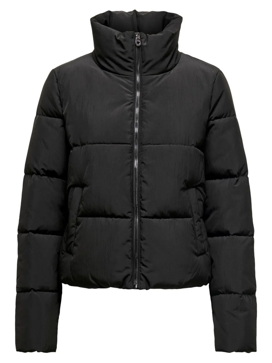 Onlyn lyhytmallinen puffer -toppatakki. Muhkea ja lämmin takki, jossa on korkea kaulus. Edessä vetoketjukiinnitys ja taskut.