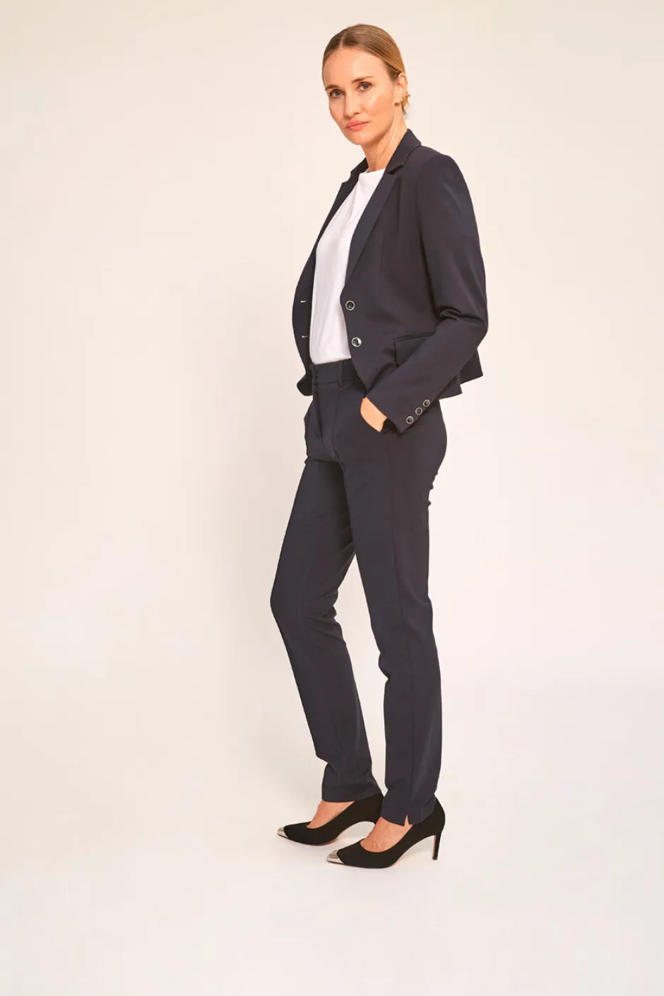 Klassiset housut, joissa suorat lahkeet ja tasku edessä. Lahkeensuissa sivuilla pienet halkiot. Valmistettu joustavasta kankaasta.