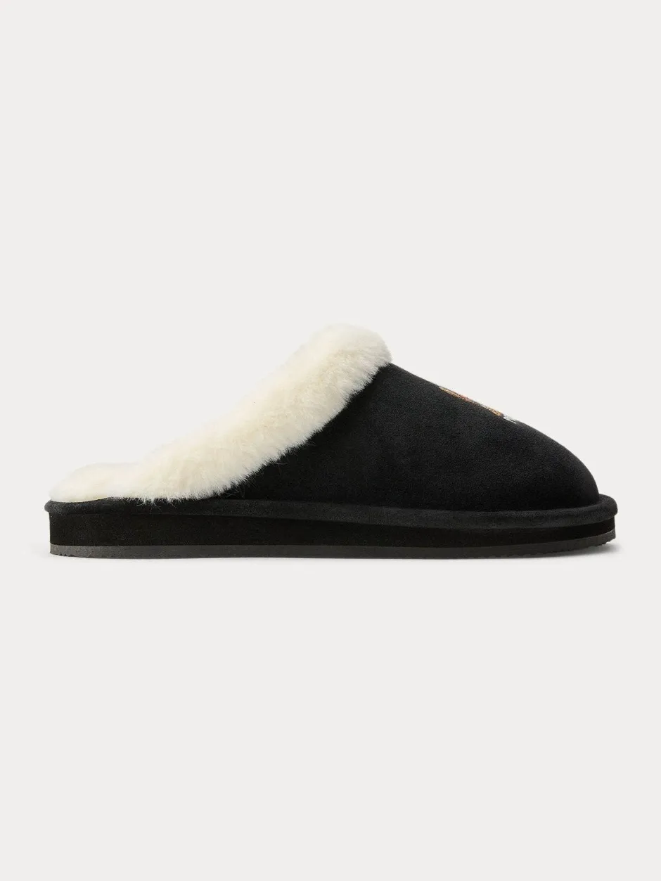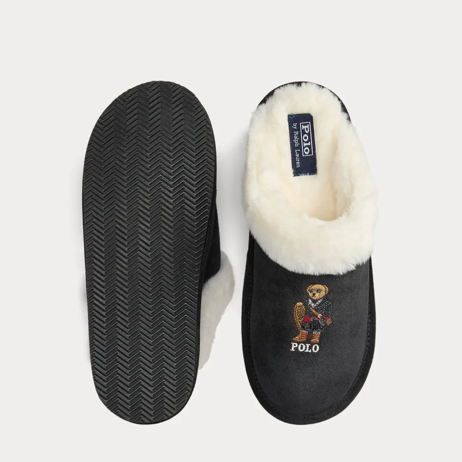 Nämä tohvelit on valmistettu mokkanahkapäällisestä ja vuorattu pehmeällä tekoturkiksella. Tohveleissa on pehmustettu sisäpohja ja kuvioitu ulkopohja, ja niissä on brodeerattu poolokarhukirjailu jalkapöydän kohdalla.