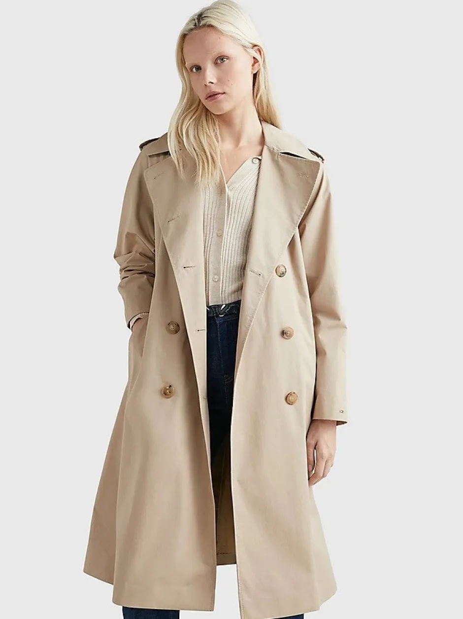 Tommy Hilfiger naisten trenssitakki. – Luomupuuvillasekoite – Kaksirivinen – Lovitetut käänteet – Vyöllinen – Myrskyläpät – Kaksi sivutaskua – Tommy Hilfiger brändätty ja lippukirjonta hihassa – Tavallinen istuvuus.
