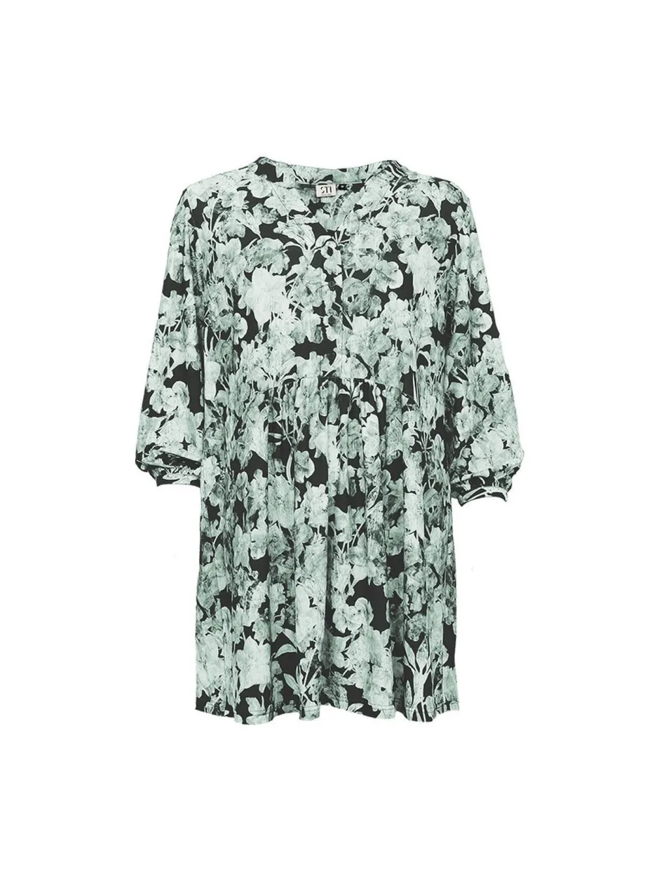 Trikootunika V-pääntiellä , jossa lyhyt nappilista. 3/4 pituiset hihat. Pituus 84cm .