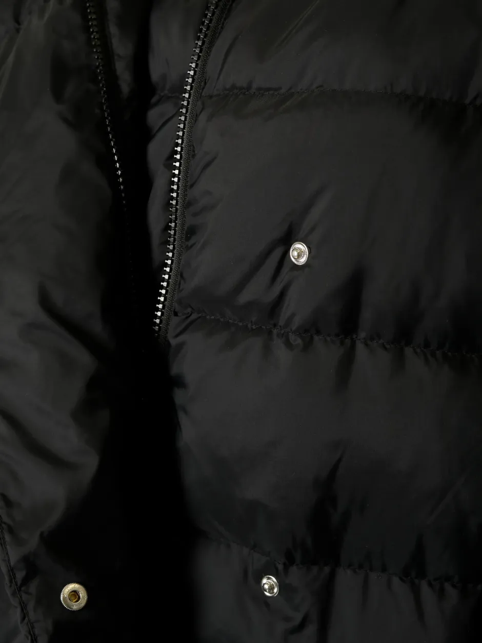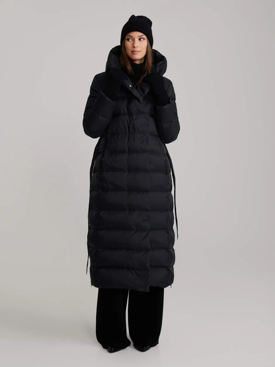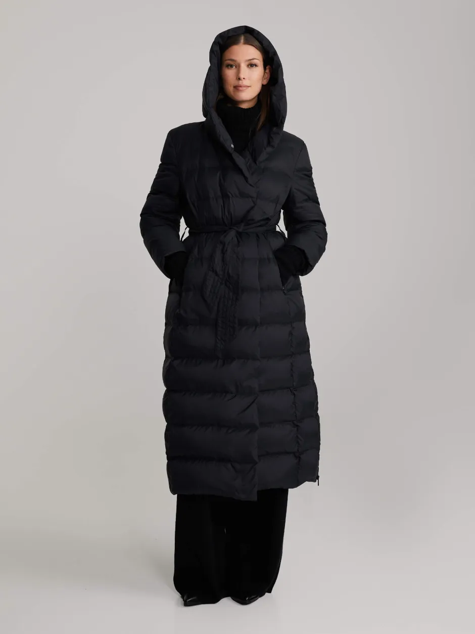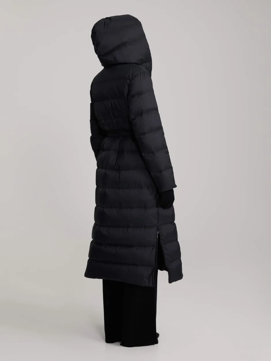 Pitkä untuvatakki, jossa shaali-tyylinen kaulus sekä huppu, vetoketju edessä ja painonapillinen tuuliläppä. Vetoketjulliset sivutaskut, irrotettava solmimisvyö ja liikkuvuutta auttavat sivuvetoketjut.