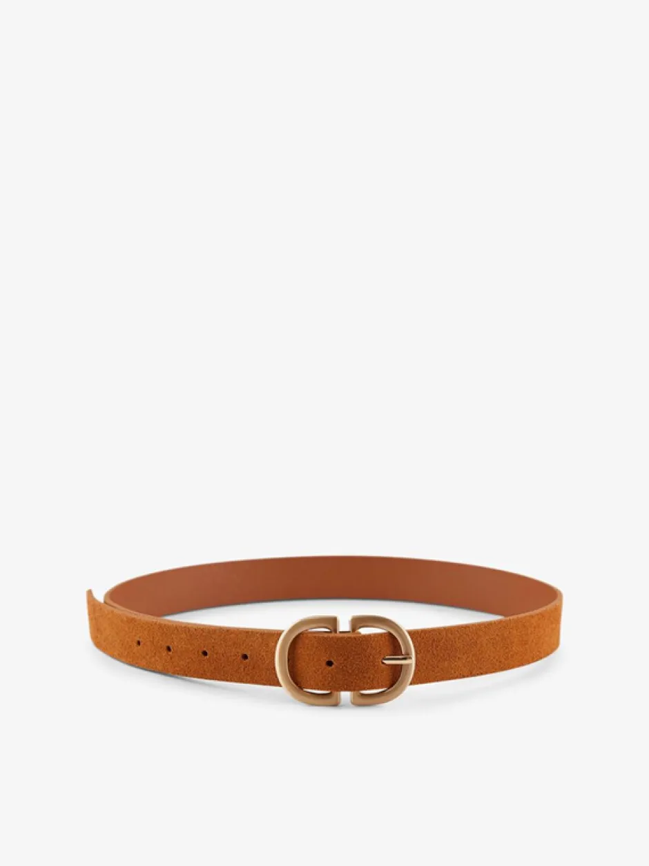 Naisten mokkanahkainen vyö, leveys 2,9 cm. Kullanvärinen solki. .