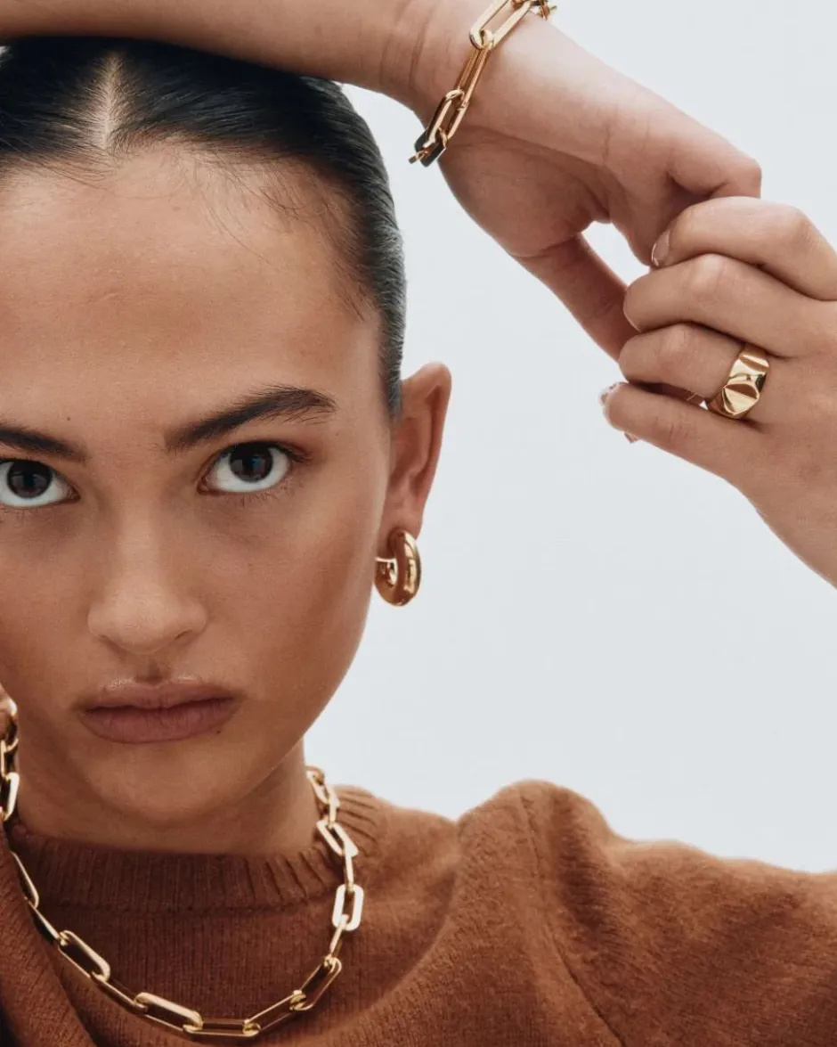 Tyylikäs ja näyttävä rannekoru, joka on valmistettu kiiltävästä ruostumattomasta teräksestä ja päällystetty 14 karaatin kultauksella. Ketjun linkkien koko on 23 × 9 mm, korun sisämitta on 17 cm ja lenkkejä on yhteensä 11. Korussa on suljettu lukitus integroitu yhdelle lenkistä, ja se on nikkeliturvallinen sekä vedenkestävä.