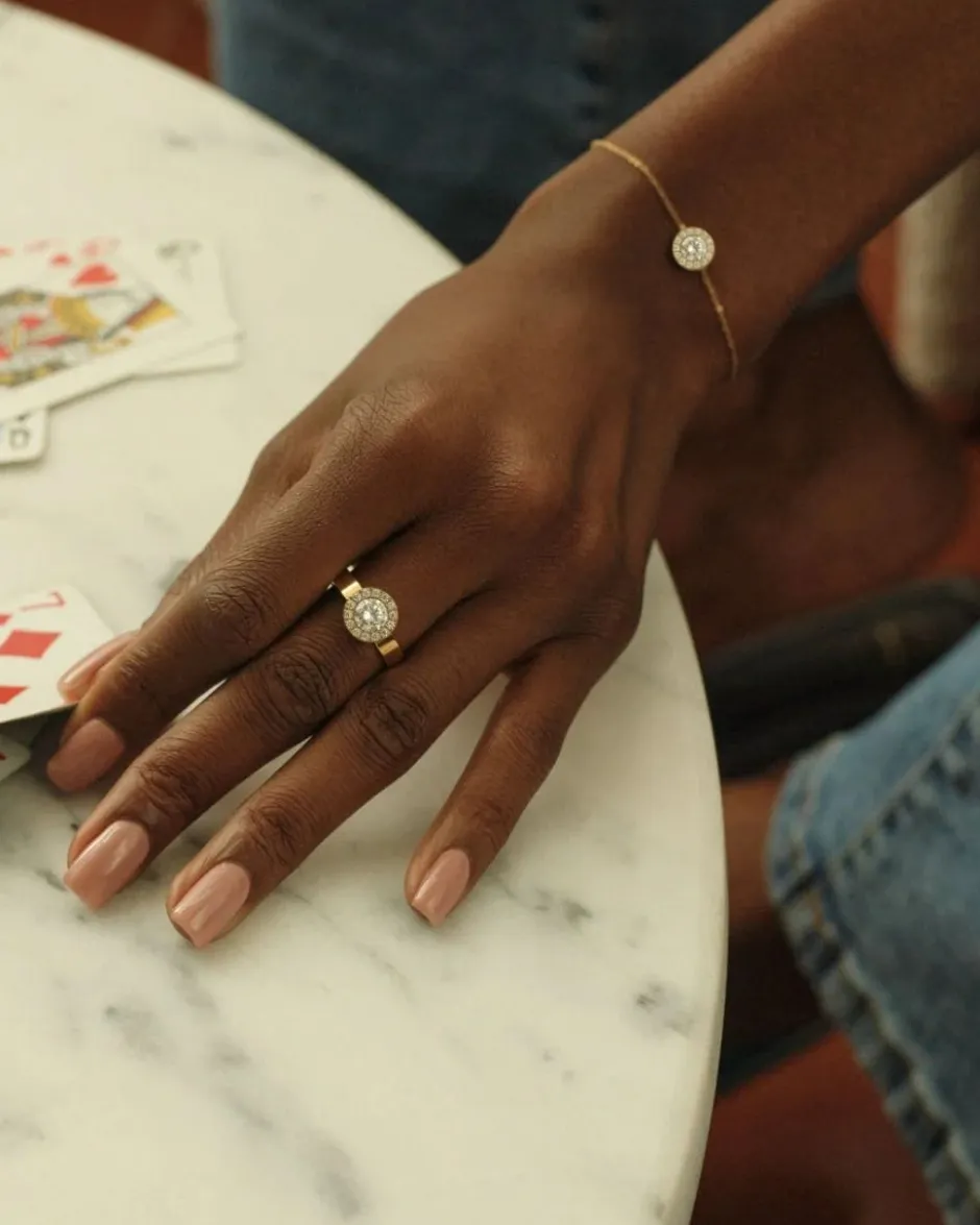 Tyylikäs rannekoru, jossa on pieni pyöreä koriste ~ 8 mm halkaisijaltaan, koristeltu yhdellä suurella ja 11 pienemmällä kirkkaalla zirkonialla. Ketju on säädettävissä pituudelle 16–19 cm. Materiaalina on kiiltävä 14 karaatin kultaus ruostumattomassa teräksessä, ja koru on nikkeliturvallinen.