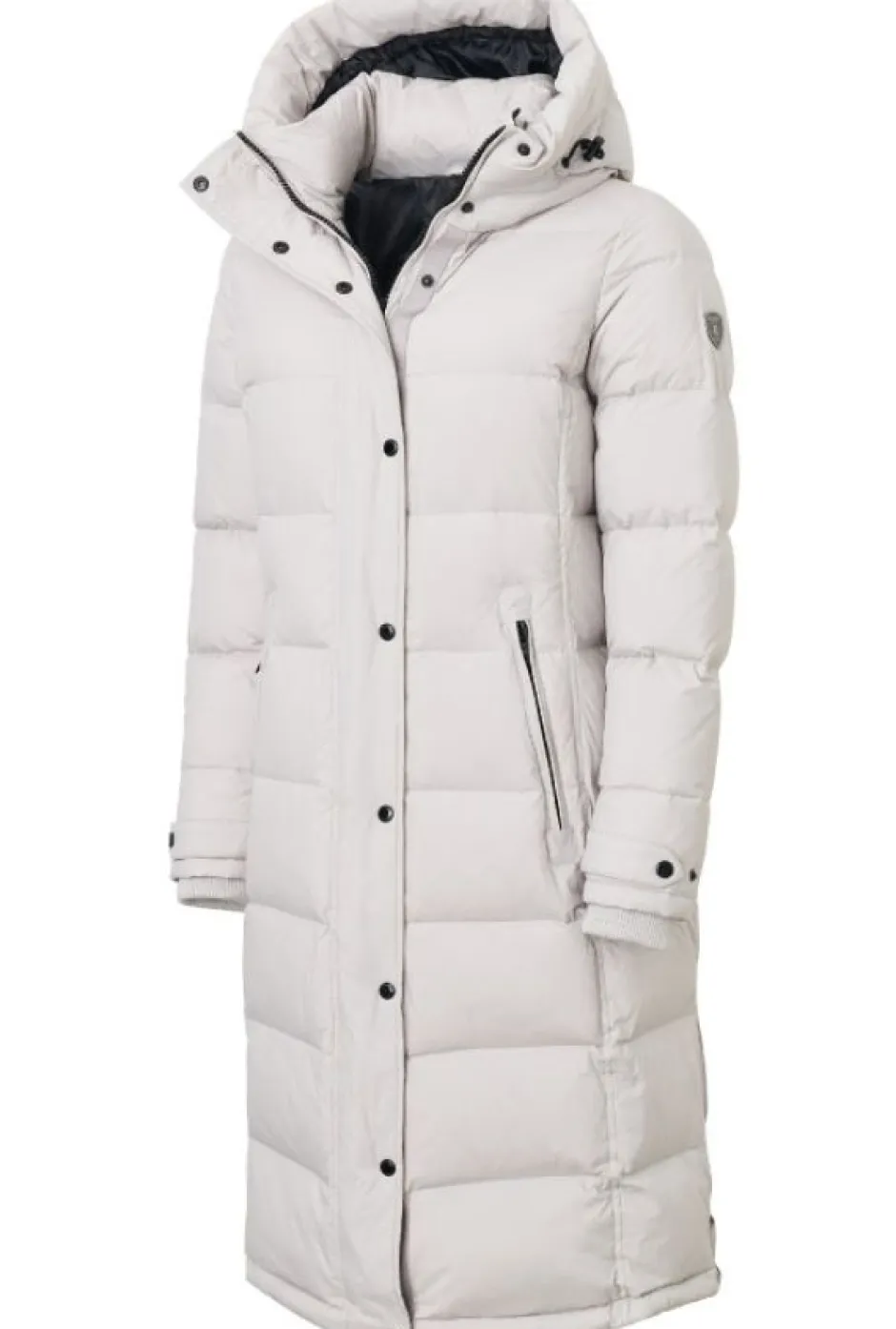 Naisten pitkä untuvatakki kiinteällä hupulla. Hihoissa sisäpuolella neulosresorit. Hupussa ja vyötäröllä sisäpuolella kiristysnyörit. Edessä tuulisuojana nepparilista vetoketjun päällä. Yksi sisätasku vetoketjulla ja vetoketjulliset etutaskut myös. Takissa on myös sivuhalkiot, jotka saa avattua vetoketjuilla. Mukavan kevyt ja notkea takki talven pakkaskeleihin. Koko 38 pituus n.108cm