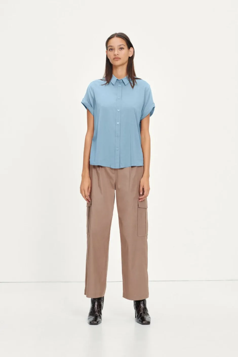 Samsoe&Samsoen rento, lyhythihainen kauluspaita. Valmistettu kevyestä ja joustavasta materiaalista, joka laskeutuu kauniisti. Skarpit kaulukset, käännetyt hihansuut, napitus edessä ja pyöristetty helma. .
