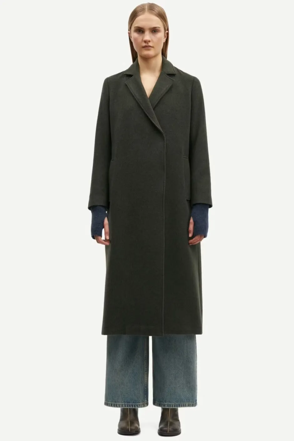Tyylikäs pitkä villakangastakki. Edessä painonappikiinnitys. Viistotaskut ja sisätasku.
