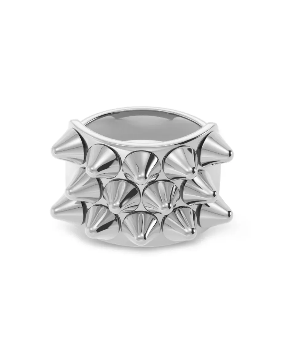 Tyylikäs statement‑sormus, joka on valmistettu kiiltävästä ruostumattomasta teräksestä. Sormuksen yläosan piikkimäinen muotoilu tuo siihen rohkean, modernin ilmeen.
