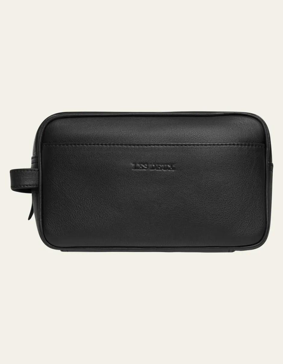 nahkainen pesulaukku on valmistettu tasaisesta nahasta ja koristeltu kohokuvioiduilla merkkikirjoituksella.